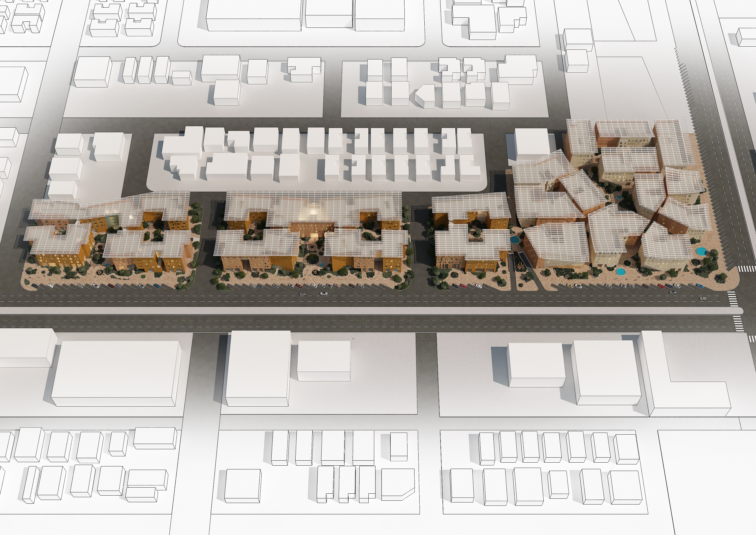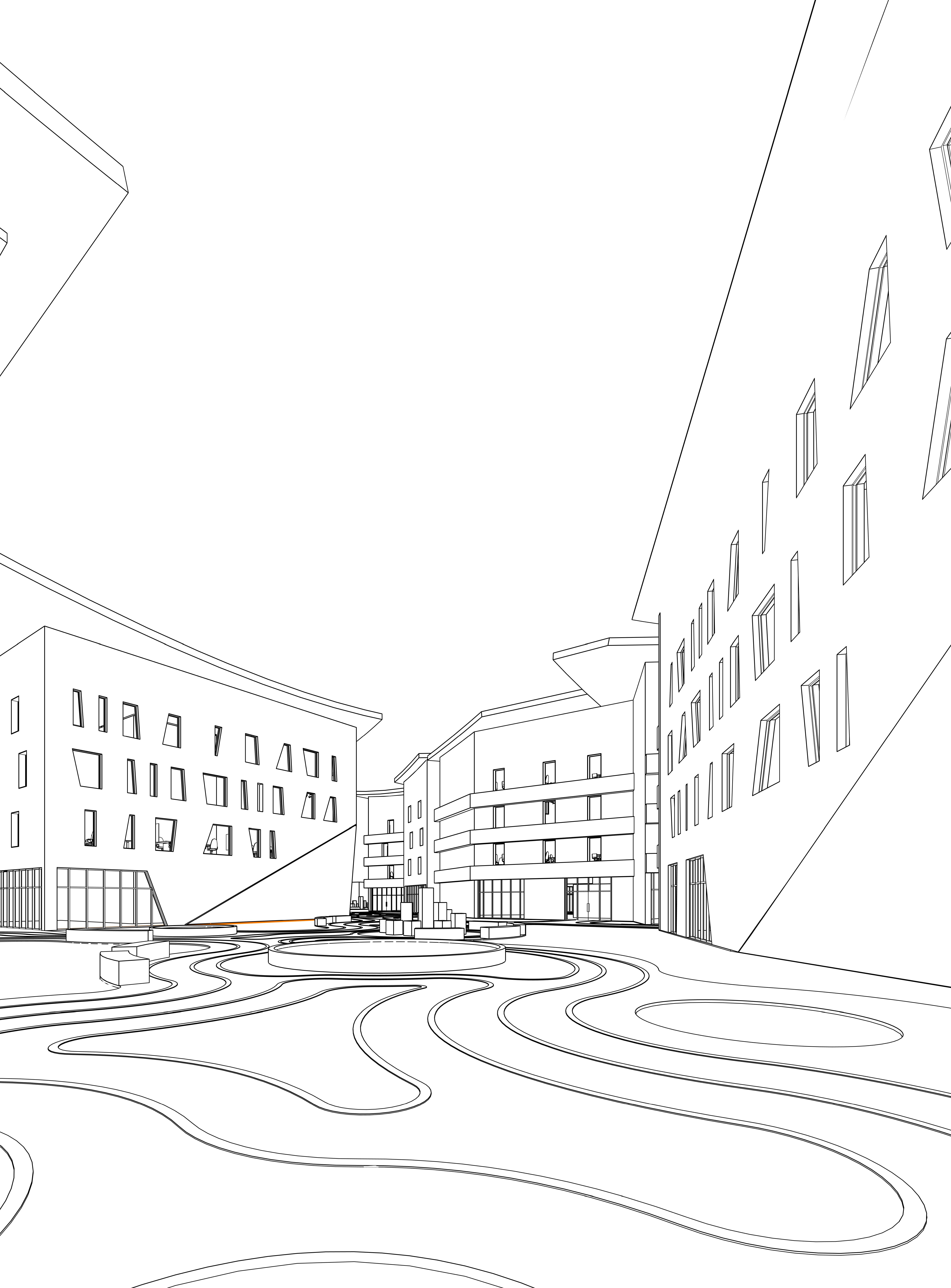 Beyond the zoning, the design vision focuses on creating engaging and memorable experiences. A central recreational hub fosters community spirit through dynamic activities and shared leisure spaces. A versatile courtyard provides a flexible setting for gatherings of all scales, adapting seamlessly to multiple functions. The architectural expression emphasizes a captivating building envelope, where bold massing and dynamic forms inspire movement, interaction, and curiosity throughout the development.
